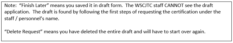 IMPORTANT: Once an application is submitted, neither you nor the WSCJTC can edit the applications. Errors in the application will result in the application being rejected and resubmissions must start from the beginning again.